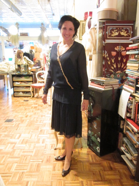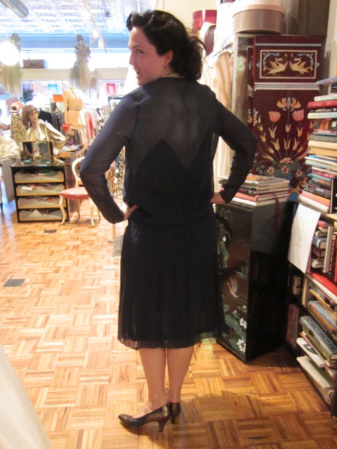 Lindy Shopper and I went on over to one of our favorite Vintage shops here in Greensboro this weekend, Design Archives, to check out their 50% off sale! She went away with a fabulous novelty print skirt, and I scored a beautiful yellow 1920’s slip dress. I also tried on this Navy 1920’s drop waist dress, but decided on the yellow instead.